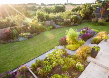 Closeup of Professionally Landscaped Flower Bed with Decorative Green Garden Plants and Evenly Mowed Lawn in the Background.